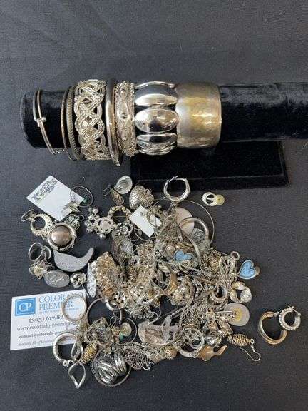 Mixed lot of silver colored jewelry, bracelets, bangles, earrings, necklaces; Rocking bird figure is marked Torino; Wear commensurate with age and use. See photos (1)