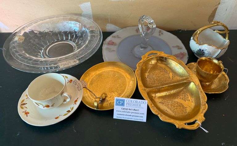 | Hall Jewel Tea teacup and saucer, Limoges France porcelain twig handled basket; Two glass serving bowls, one painted glass cookie tray with handle; Gold color divided dish marked "Noritake China, Japan", demitasse cup and saucer, finger plate marked "Helen Miekie, 1928"; Largest glass bowl measures approximately Diameter 11 3/4 inches; Visible discoloration and scratches, wear commensurate with age. See photos (B) |