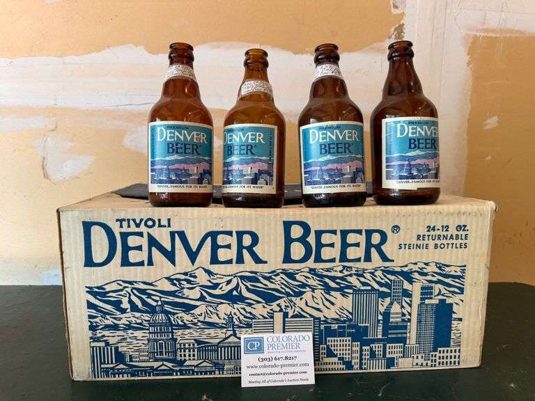 | Vintage Denver Beer bottle box, holds 24 bottles; Four brown glass Denver beer bottles; Each bottle is 12 ounces; Wear commensurate with age. See photos (B) |