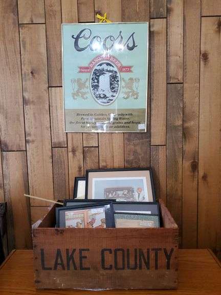 One karge wooden crate marked "Lake County" filled with nine framed vintage and antique ads and ephemera; Brands and artists include "Coors", "Bell Telephone System", "Chevrolet", "Oldsmobile" "Coca-Cola" and "Turner"; Coors ad measures approximately H 16 x W 20 inches; Items show age appropriate wear. See photos Pick-up in Evergreen, CO (B1)