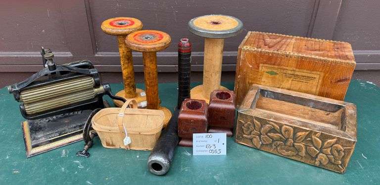 | Crown linen pleater dated 1877; Two California redwood pencil holders; Copper relief box; Fiberloid wood, hand hammered box; Four wood spindles; Box measures approximately H 10x W x 7 1/2 x D 5 inches; Working conditions unknown, wear commensurate with age and use. See photos (B) |
