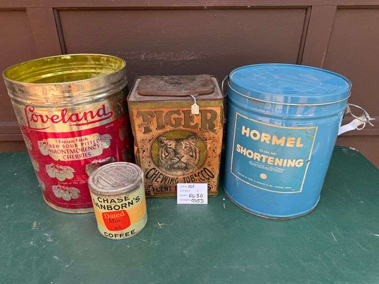 | Four vintage tins; Tiger Chewing Tobacco, Loveland Cherries, Chase Sanborn's Coffee with paper bottom and metal top, Hormel Shortening; Tiger measures approximately H 11 x W 8 x D 6 inches; All are worn and damaged. See photos (B) |