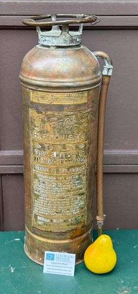 | Vintage brass fire extinguisher marked " Buffalo Fire Appliance Corp., number 1177"; Measures approximately H 23 x Diameter 7 1/2 inches; Working condition unknown, wear commensurate with age. Pick up in Evergreen. (G) |