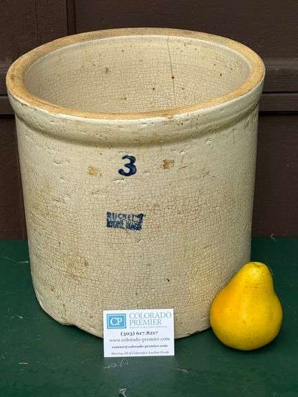 | Vintage 3 gallon crock marked "Ruckel's Stone Ware"; Measures approximately H 11 x Diameter 11 inches; Visible crazing and cracks. Pick up in Evergreen. (G) |