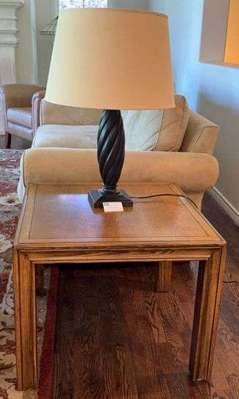 Wood side table; Table lamp; Table measures approximately H 22.5 x W 28 x D 28 inches; Used condition, lamp in working condition. See photos. Pick up and Longmont. (K)