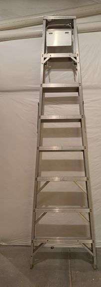 Folding metal ladder that is approximately 8 feet high; In used condition; See photos. Pick up in Longmont (B).
